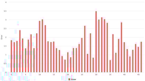 Bar graph of average error (in meters) at 47 points in the HYBRID method.