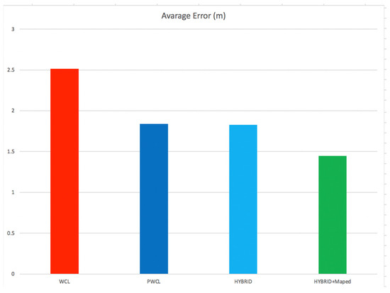 Bar graph of average error (in meters) at 47 points in the PWCL method.