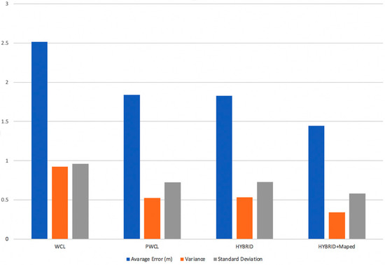 Bar chart of mean total error (in meters), variance and standard deviation in four different methods.