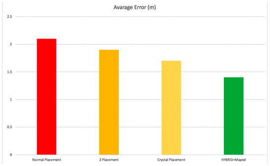 Our study builds upon the foundational work of Dr. Rezazadeh [8], who explored iBeacon placement for indoor positioning. By improving upon their methodology, particularly through the development and application of the Positive Weighted Centroid Localization (PWCL) and HYBRID-MAPPED algorithms, we achieved a marked reduction in localization errors [7,8,21,22]. The average error in our HYBRID-MAPPED method was 1.44 m, which is a significant improvement compared to traditional WCL methods that showed an average error of 2.51 m. This aligns with findings from similar studies that emphasize the importance of algorithmic enhancements and optimal hardware placement for reducing localization errors.