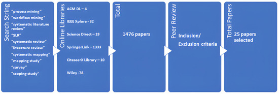 The search process began on 1 February 2023, providing a comprehensive overview of the process mining literature over a specified timespan. The search string defined for this research was: