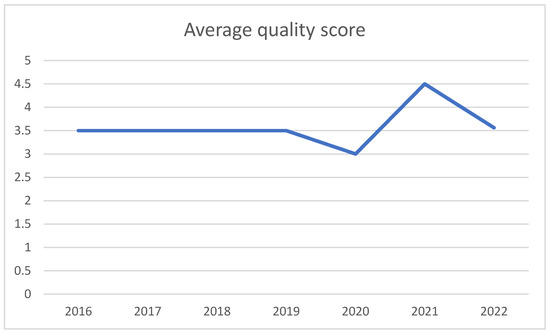 The quality score and publication year of each study included in this research are shown in Table 5. The average quality score for SMSs/SLRs in the field of process mining is 3.5, indicating that the studies published are mostly in the upper bounds of medium quality. By analyzing the quality scores per year (Figure 3), we observe similar quality levels for studies published between 2016 and 2019, with an average score of 3.5. The quality seems slightly lower for studies published in 2020. The highest average quality score is observed for 2021. However, generic conclusions cannot be drawn, as there was only one study among the included studies published in 2021. Finally, the trend in the average quality score returns to 3.5 for 2022, confirming that for the years covered in this research, the studies included are of medium quality, a trend that remains unaltered throughout the years, with a few exceptions, based on the included studies in this research.