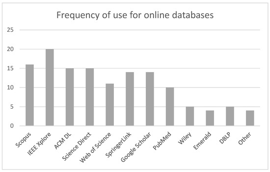 Thirteen different online databases were identified and used by the included studies. A complete list of the databases used in each one of the studies can be found in Appendix A (Table A2 and Table A3). The picture below (Figure 4) summarizes the most preferred online databases: IEEE Xplore, Scopus, ACM DL, Science Direct, SpringerLink, and Google Scholar. It should be noted that in most of the cases, Google Scholar is used most as a source to identify additional studies, rather than as a primary source to locate studies for inclusion.
