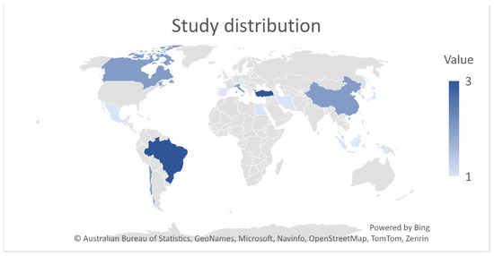 The fact that the 25 studies included in this research have been published in 23 different venues (13 studies were published in journals and 12 studies were published at conferences, as already mentioned) can be considered an indication that there is a broad set of related areas, apart from the field of information technology, that PM can be applied to. Researchers focused on this field have a wide range of venues to submit their research. Although there are no specific trends in publishing venues, there seems to be a trend in the geographical areas where the studies are being conducted. The primary authors were distributed within the five continents (Figure 6). Nine studies (36%) emerged from Asian countries (Turkey, China, Iran, Indonesia, Japan, and Malaysia), seven studies (28%) emerged from European countries (Estonia, Spain, the UK, Italy, Belgium, and Czechia), and the rest of the studies were developed in America (five studies in South America (Brazil and Chile) and three studies in North America (Canada and Mexico)), with one in Africa (Egypt). Turkey and Brazil are leading the research in SMS/SLR studies in process mining, as they have published three studies each that are included in this work. It is also worth mentioning that there are no SMSs/SLRs from the USA. This observation has also been noted in the tertiary study of Barros-Justo et al. [23]. The thematic findings underscore process mining’s extensive applications across domains such as healthcare, cybersecurity, and agile software development, showing its broad impact.