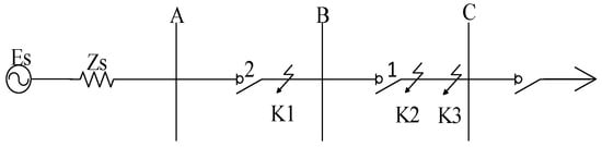 where E is the phase electromotive force of the equivalent power supply of the system; is the minimum impedance between the protection installation to the equivalent power supply of the system; is the impedance of the protected line; and is the reliability coefficient, which is generally taken as 1.2~1.3. Set in the line αL at the occurrence of a short circuit fault (0 ≤ α ≤ 1, L is the length of the line), the short circuit current is as follows: