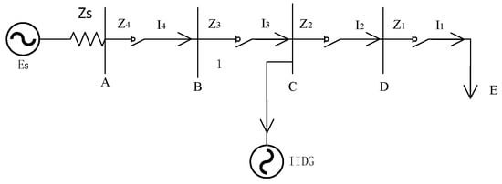 In the event of a fault in the grid, an inverter-based distributed generation system (IIDG) injects reactive power into the grid-connected point, thereby effectively boosting the voltage level at that point. The impact of the reactive power injection on the fault current is subject to significant geographical variation, which must be taken into account when assessing the effectiveness of such a system in different locations. In the event of a fault occurring in the downstream region of the IIDG, the short circuit current detected by the downstream protection device will be greater than that which would be observed in the absence of IIDG involvement. This is due to the voltage enhancement that occurs as a result of the IIDG’s involvement in the fault. Conversely, if the point of the fault is located upstream of the IIDG, the fault current will be reduced as a result of the reactive power support effect of the IIDG. The extent of this reduction is directly proportional to the output power of the IIDG []. The following sections will examine the optimization and analysis of the protection strategy of the distribution network following the connection of the IIDG to the distribution network. This will entail the combination of traditional current protection methods in order to accommodate the changes brought about by this new type of power generation [].