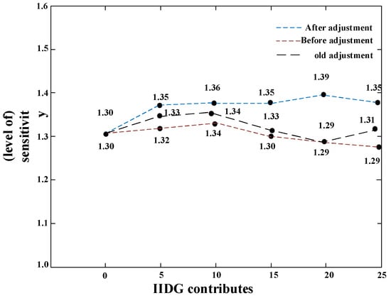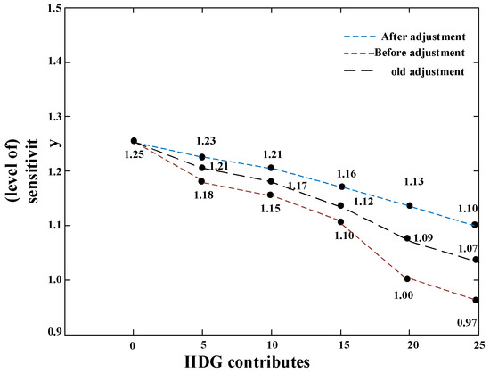 Figure 11 shows the sensitivity adjustment of the Current III section at different IIDG outputs. As the IIDG output increases, the sensitivity decreases faster than the Current II section sensitivity, and especially, the curve is steeper and decreases faster when exceeding 50% of the IIDG-rated current. Using the method in Section 5 for threshold adjustment, the adjusted sensitivity also increased significantly, verifying the effectiveness of the method in the Current III segment.