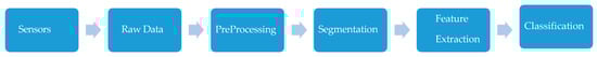 The activity recognition chain [] propounds the framework for activity classification applied to machine learning. It summarily involves data reading from sensors, preprocessing, segmentation, feature selection, and classification as can be seen in Figure 1. While most HAR studies rely on this protocol, its effectiveness can be stymied by validation methods, which are techniques used to estimate how well they will generalize to unseen data by evaluating them on different subsets of the available data [].