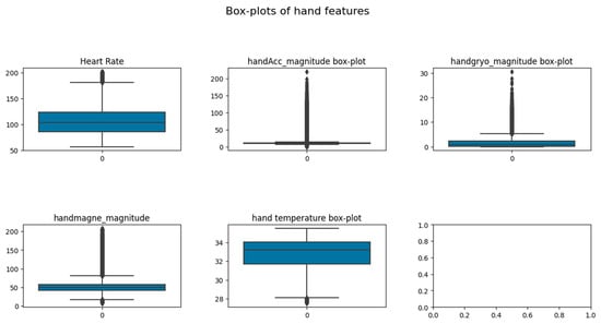 Exploratory Data Analysis (EDA) was carried out to visually present trends in the dataset using the Python Seaborn and Matplotlib libraries [,,,,,,]. For intensity and visualization of the sensor data, the magnitude of the sensor features was derived. Box plots of the sensors, along with heart rate and temperature features, were plotted for outlier detection. While extreme outliers were detected, as seen in Figure 3, none were removed, as abnormal data readings are expected during vigorous activities.