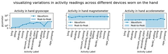 The relationships between the features and trends in the sensors were explored. Figure 4 shows the variations in the hand sensor reading across the activities, with the gyroscope capturing the most variation in activities compared to the other devices, especially during rapid movements.