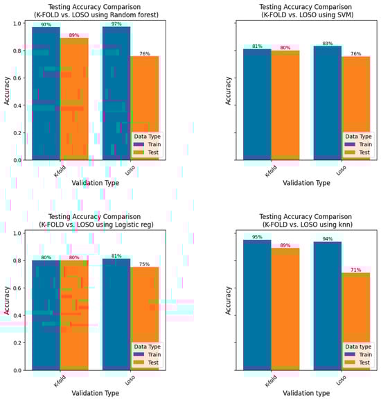 Figure 5 shows the training and testing accuracies of all four models validated on eight-fold and LOSO CV.
