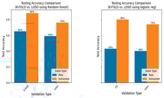 Testing accuracy comparison of raw sensor models and feature-trained models validated with k-fold and LOSO on random forest and logistic regression classifiers.