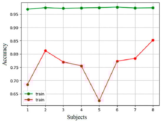 In considering performance improvements on LOSO to develop a model that generalizes better, training with a similar population to user characteristics should be considered. Evaluating the subject-level performance of LOSO in Table 6, the highest testing accuracy of 87% was achieved when the model was trained on subjects 1–7 and tested on subject 8, while the lowest accuracy was achieved when the model was trained on the other subjects and tested on subject 5. These results are caused by the semblance and dissimilarity between the validation subject and those included in the training set, respectively. This means that subject 8 has a high similarity with the trained subjects, while subject 5 has a low similarity. Figure 7 captures this trend. Training models on data similar to those of its final user increases its adaptability and performance. Previous studies [,,,,,,,,,,,] highlight this, where fitness level contributed to the characterization of sporting activities like running, and demographics like gender and body physique informed moderate activities like walking.