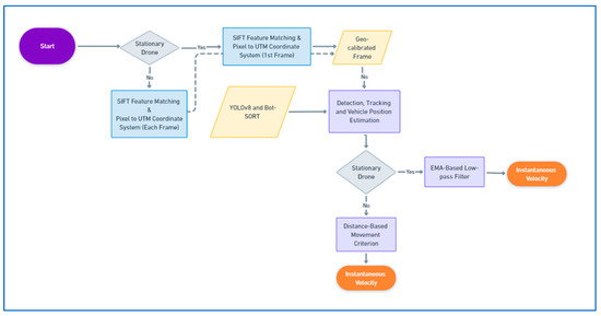The computational expense of processing nonstationary drone footage is a significant limitation. On a system with an Intel® Core™ i9-9900 CPU @ 3.60 GHz and 64 GB RAM, the average processing time for nonstationary drone footage was 63 s per frame, compared with just 0.42 s for stationary drone footage. The longer processing time for nonstationary footage is due to the computationally expensive SIFT application for each frame. However, this can be reduced by 8% through the use of precalculated key points and descriptors. Georeferencing also causes errors, resulting in jumpy locations across frames, requiring aggressive noise removal methods, such as movement threshold. Nonetheless, the proposed system can accurately estimate vehicle speed and position. Future research will be focused on computational optimization techniques and innovative data-denoising methods for improving output quality in nonstationary drone footage.