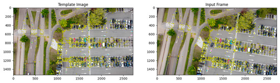 An orthomosaic template image was created to project geographical space onto the input footage using a DJI mini 3 pro drone flying at 90 m, equipped with a 48-megapixel camera set at an angle of 90 degrees. A visual line of sight was maintained throughout the flight, and several images were taken to generate orthomosaics over a larger area. The image was then georeferenced using the WebODM application of OpenDroneMap, and an orthomosaic was constructed with a UTM projection system. This georeferenced image acted as a template to automatically transfer geographical coordinates onto each frame. The process involved identifying the matching features between a template image and the input frame and then georeferencing the input image based on the matching key points (as illustrated in Figure 2). For the quality assurance of descriptors, Lowe’s ratio test was employed, and only the matches passing the criteria were used for the homography calculation [24]. The root mean square error (RMSE) threshold was also enforced as an additional check, and frames with a higher RMSE were discarded [25].