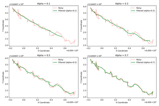 Comparison of noisy and EMA-filtered trajectories with different alpha values.