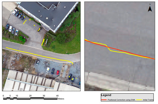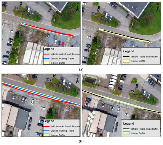 In the absence of a reference vehicle position, the buffer overlay method can be used to measure the accuracy of mapped vehicle trajectories. A vector path of the actual vehicle path was drawn manually, considering the target vehicle’s position with respect to time, and a buffer of 1 m was constructed (illustrated in Figure 8). Then, the tracks generated by the proposed method were compared with the ground-truthing buffer, calculating the total length inside the buffer.