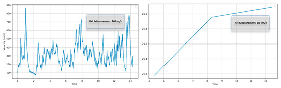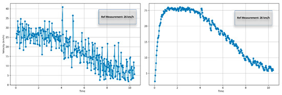 The fluctuations in velocity (in km/h) over time (in seconds) and the removal of errors using an EMA-based low-pass filter (α = 0.1). The single-point reference speed measured by the speed gun was 26 km/h.