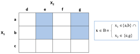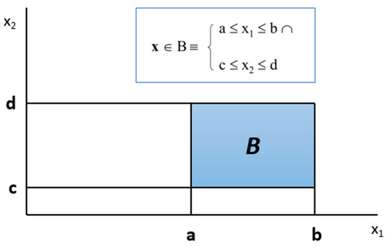 where x ∈ B (xj sj). When si = Si, we leave xi out of the box definition since it may take any value in its domain. Figure 2 shows an example of a box defined on two numeric variables, where x B x1 [a,b] x2 [c, d]. Figure 3 shows the definition of a box if the variables are categorical, where x B x1 {a, b} x2 {c,d}. A box can also be defined by numeric and categorical variables at the same time.