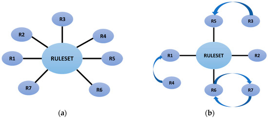 An illustration of the organization of rules in the ruleset using metarules. (a) Display of the ruleset without the organization. (b) Illustration of the new organized ruleset with association between R6–R7, R1–R4, and R5–R3. The one-way relationship between R4 and R1 shows that R4 is more specific than R1.