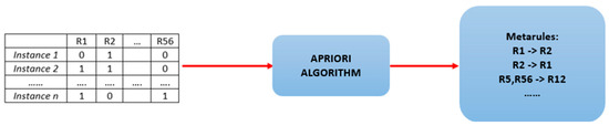 The finding of a metarule is a process where rules are considered items. The first step is the establishment of a binary matrix with the examples and the rules. If the instance is in a rule, then it is a one; else, it is a zero. Once we obtain the transaction matrix, like in the basket analysis problem, we apply the APRIORI algorithm to find associations between the items, which are the rules in our case. This technique allows two things: the first is to find the association between the rules of the same class label, and the other one is to find if there is an association between the rules of different class labels. With this technique, we provide the expert with a new organization of the rules. Figure 5 illustrates the process of creating metarules.