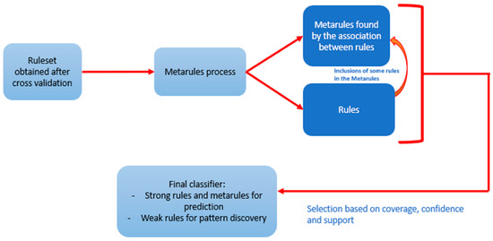 This method has been used as a pruning technique for other rules in machine learning than just the association rules. In [18,19,20,21], the authors apply the concept of the metarules to optimize and increase the interpretability of their models. They use the rules generated by random forest or R-CAR as the items in the dataset, and then they apply the APRIORI algorithm to find the associations between the rules.
