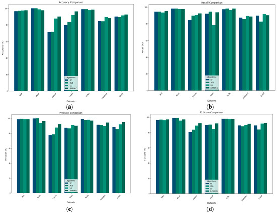 The recall, precision, F1-score, accuracy, and evaluation of the R-PRIM-Cl algorithm across multiple datasets in Table 5 and Table 6 show that it performs consistently well, frequently surpassing or closely matching other industry-leading algorithms such as random forest (RF), XG-Boost (XGB), and logistic regression (LG). R-PRIM-Cl performs well in terms of recall, especially when it comes to datasets like Cancer, Heart, and Credit, where it attains the highest recall, proving that it is efficient in detecting true positive cases without overlooking pertinent cases. According to precision results, R-PRIM-Cl frequently has fewer false positives than other models and is very accurate in its positive predictions. This is especially true in datasets like Cancer, Diabetes, and Credit, in which the cost of false positives is high. The robust performance of R-PRIM-Cl is further highlighted by the F1-score, which provides a balance between recall and precision. It consistently manages false positives and false negatives with effectiveness, and it excels in the Cancer and Heart datasets in particular. Figure 7 offers a visualization of the performances of the four algorithms on the seven datasets for each measure, being Figure 7a for the accuracy, Figure 7b for the recall, Figure 7c for the precision, and Figure 7d for the F1-score.