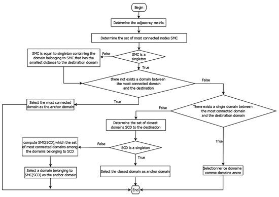 - Step 5: Determine the set of domains closest to the destination, . If this set is a singleton, then the closest domain is taken as the anchor domain. Otherwise, a domain d belonging to SMC(SCD) is taken as the anchor domain. SMC(SCD) means the set of most connected domains among the domains belonging to SCD.