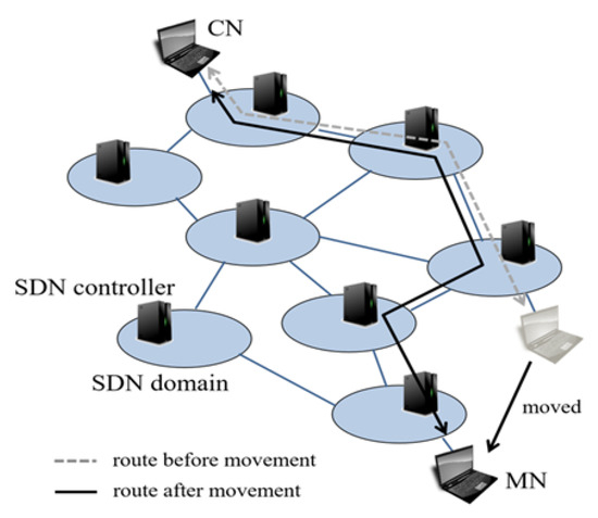 Today’s Internet is predominantly driven by wireless technology and its extensions. When coupled with the Internet, wireless technology provides access to a myriad of services available at all times, even while on the move [1]. However, this extensive use poses a problem when considering the design of the Internet. The architecture of the Internet is primarily based on logical connections between a clearly identified source, which includes its IP address and other parameters, and one or more identified recipients. Hence, when even one of these parameters is modified during movement, the connection is reset, potentially causing intolerable delays for certain real-time service applications. Ensuring service continuity during the movement of a mobile node is a genuine challenge as some applications and services are less tolerant of disconnection delays. Hence, the problem addressed in our study can be stated as follows: Given a multi-domain network, and a mobile node in the network, how can we find a path to reduce data transfer delay when the mobile node moves between two different domains. The challenge of managing mobility in multi-domain networks, especially in ensuring uninterrupted IP traffic flow, has been a persistent challenge that has been tackled through different methods throughout the years. These solutions, such as Mobile IP, Proxy Mobile IP, and Distributed Mobility Management, have unique benefits and drawbacks. Lately, software-defined networking (SDN) has become a promising solution for managing networks effectively. In fact, SDN is a network architecture that aims to be dynamic, manageable, economical, and flexible in order to be appropriate for the high-bandwidth, dynamic applications of today [2]. Its fundamental idea of dividing the control plane from the data plane has made a revolution in networks possible in a number of ways [3,4,5]. SDN controllers make up the control plane, whereas switches, or forwarding elements, make up the data plane. A number of benefits are provided by SDN, including bespoke application-driven network management, flexible programmable control, and dynamic routing [6,7]. By integrating SDN with mobility management, an improvement of route selection is achieved when a mobile node (MN) moves within an SDN domain [8]. In the context of SDN, a domain typically consists of network devices (e.g., switches, routers) managed by a single SDN controller [9]. Moreover, a domain refers to a logically or physically bounded part of a network that operates under a specific administrative control. The role of SDN in a multi-domain architecture is crucial, as it enables centralized control over heterogeneous networks while ensuring interoperability between different domains. This capability is particularly relevant in scenarios involving mobility management, where seamless communication across domains is essential for reducing latency and ensuring service continuity.