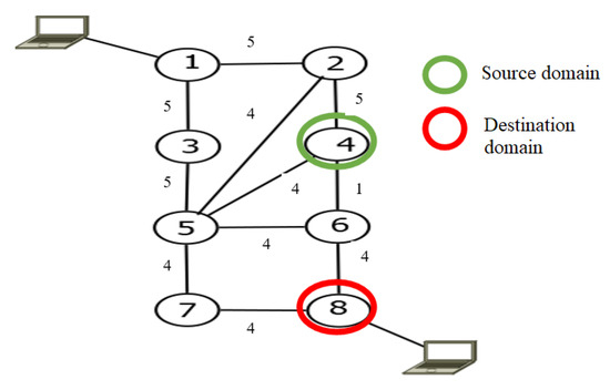We present two figures, Figure 3 and Figure 4, which serve as the basic architecture to illustrate our method. Figure 3 represents the network with eight (08) domains in which a corresponding node is fixed and a mobile node moves. When the mobile node moves from one domain to another and connects to it (each domain is represented by a node that is actually the domain controller), the controller of that domain then detects a new registration and initiates the handover procedure for that mobile node. Figure 4 is a simplified representation, showing the links between each domain with their weights (representing bandwidth values) and the domain numbers to locate the mobile’s movement. The service requires a minimum bandwidth of 400 Mbps (). In the next two paragraphs, we illustrate the first stage and then the second stage of the RI-SDN method.