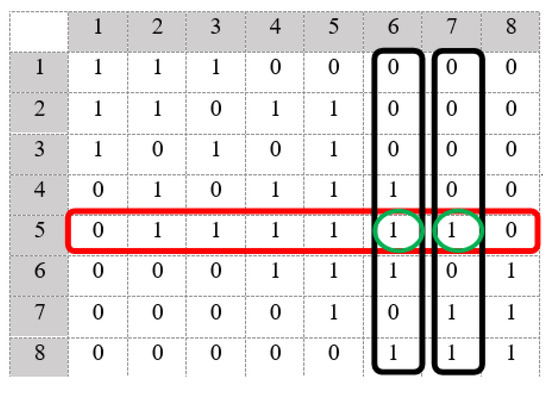 - is a singleton. We check whether there are any nodes between this node and the destination node. On the adjacency matrix, nodes 6 and 7 are connected to both node 5 and node 8 (the destination node), as indicated by the black lines and the small green circles.