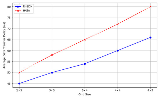 As shown in this figure, RI-SDN consistently maintains lower data delay transfer across all grid sizes compared to HATA.
