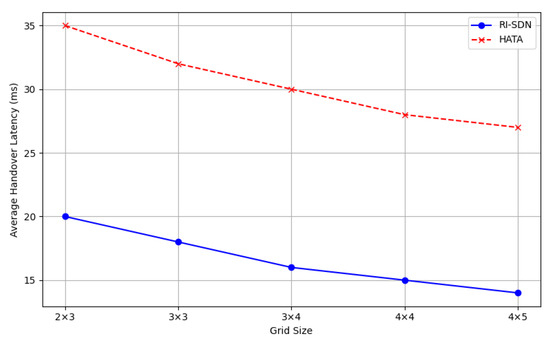 As shown in this figure, RI-SDN consistently exhibits lower handover latency compared to HATA. For the smallest grid size (2 × 3), RI-SDN achieves an average latency of 20 ms, while [19]’s latency is significantly higher at 35 ms. This trend continues across all grid sizes, with RI-SDN maintaining a lower latency as the grid size increases. Note that HATA denotes the proposed method by Hata et al. in [19].