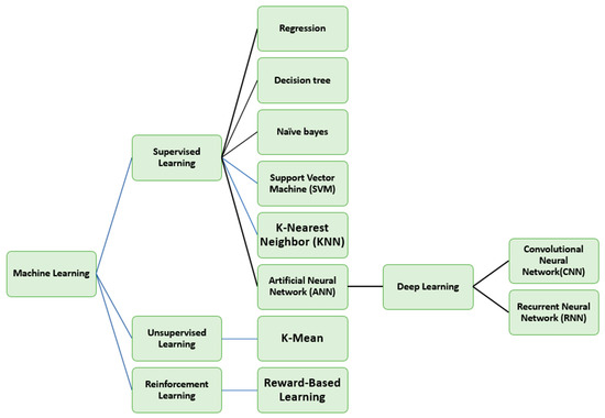 AI systems include a wide range of models that can be trained and can learn to extract knowledge based on a dataset. Machine learning is a subset of AI that can be trained on a dataset to analyze data and classify or predict future events in new data. A subset of machine learning is deep learning, which is a multiple-layer artificial neural network that extracts features from data and makes a decision. More details about machine learning models used in the literature, and deep learning as a subset of machine learning, are shown in Figure 1. According to the learning process, there are three common types of ML algorithms: supervised, unsupervised, and reinforcement learning. In supervised learning, the machine is trained by mapping between input and output variables to predict the output for the labeled data. Unsupervised learning uses unlabeled data without guides. Reinforcement learning is a method of programming agents by rewarding and punishing them for completing tasks without specifying how they should be completed.