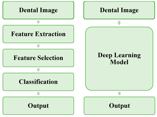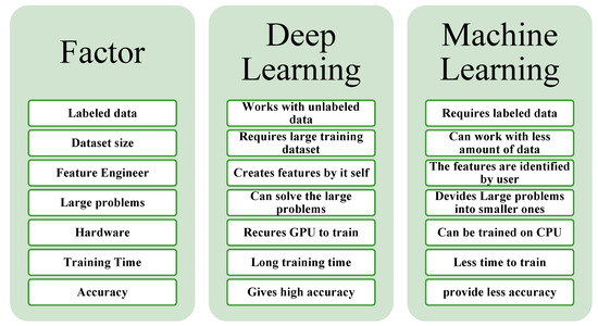 Figure 2 and Figure 3 illustrate a comparison between DL and ML approaches. Since DL techniques include numerous hidden layers, they often demand greater computing power, whereas ML models just need to execute a small number of mathematical operations. The application of deep learning models has shifted the research focus from image processing for feature extraction and selection to deep neural network construction for optimal performance.