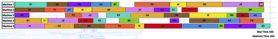 Figure 2 presents the Gantt chart of the best-known solution for the LA01 instance. The solution achieves an optimum time of 666.
