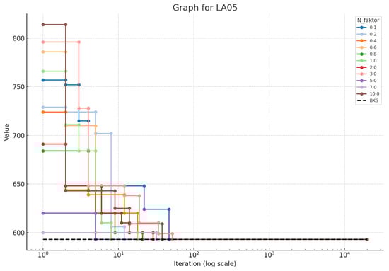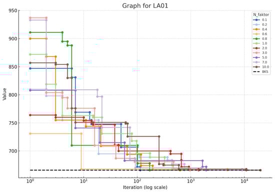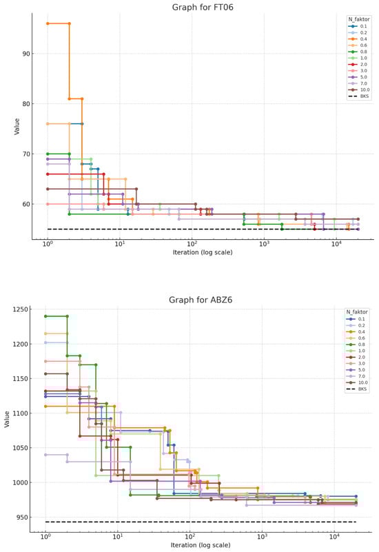 In this study, we present the results of experiments conducted on 17 well-known JSSP problems. For each problem, we conducted a number of scenarios in which two parameters were varied. The parameter runs over six values, i.e., 0%, 1%, 2%, 3.5%, 5%, and 10%, and the parameter T over 11 different values, i.e., 0.10, 0.20, 0.40, 0.60, 0.80, 1.00, 2.00, 3.00, 5.00, 7.00, and 10.00. For each combination of and T, we conducted 20,000 experiments. Table 1 shows the best objective function values obtained for each and T combination.