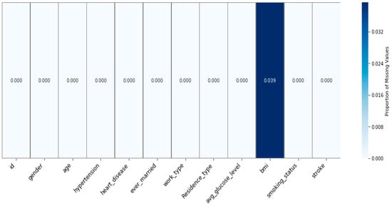 The dataset used in this analysis is publicly available in Kaggle’s Stroke Prediction Dataset []. The dataset is in CSV format and contains 5110 observations with 11 variables, of which 10 are independent, and 1 is the target (Table 1). The target variable, called “stroke”, indicates whether there is a risk of stroke or not. The value of “0” indicates no risk of stroke, while a value of “1” signifies a risk of stroke. The dataset shows a significant class imbalance, with about 95.13% of observations indicating no risk of stroke and only 4.87% showing a risk of stroke. There are missing values (Figure 1) that can result from incomplete data collection, or some errors related to data entry. Identifying these missing values is a prerequisite to accurately solving the problem and finding the best approach to address the underlying issues in the data gathering and preparation. Structuring the dataset and the issue of missing data points within the dataset are critical features that must be taken into account during the preprocessing process and the actual modeling.
