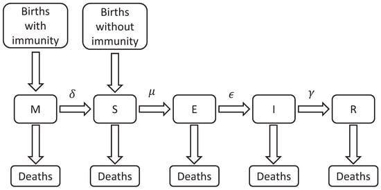 According to [12], the dynamic model of the compartmental system MSEIR is defined by the following set of ordinary differential equations