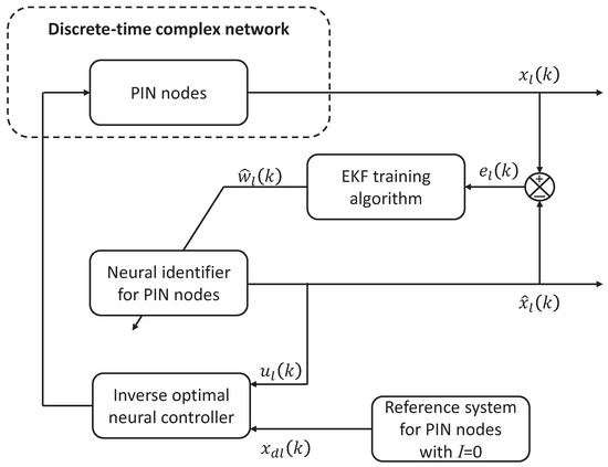 This iterative equation is implemented for each state variable of the nodes to be controlled, with known as the vector that contains all the neural network high order terms. This neural equation must be implemented for every state variable of each node that is updated with a sampling time according to update of state variable of each node, which means values of M,E,I,R in (2). In other words, it only requires the measurement of the state variables but not model parameters (2) nor its disturbances (effects of interconnections and interactions) or the presence of unmodeled dynamics, this allows a model to be obtained that matches with the dynamics of the measured data that also adapts online through a learning algorithm based on the Kalman filter [13,15].