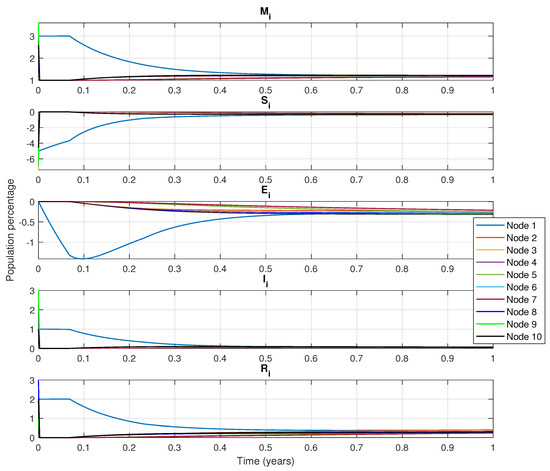Matrix directly affects the vaccination strategy. and affect the node dynamics to be controlled by MSEIR. Simulations show that the dynamics of the MSEIR model are parameterized in the case of infection caused by the SARS COVID-19 virus. The parameters are selected as follows , , , and with the time unit given in days, considering a life expectancy of 76 years and under the assumption that 65% of the population of nodes 1 and 2 will be vaccinated during months 2 and 12 while also considering that the mother give immunity to their offspring during the first 6 months. The initial values for the simulation of the MSEIR model are selected as , , , N, and , and .