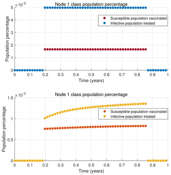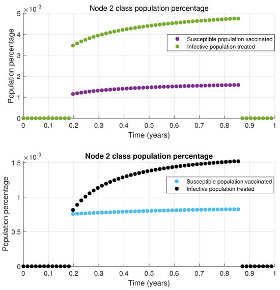 The results presented in Figure 4 indicate that the infected population decreases to a low level. While it does not reach zero, it remains significantly lower than scenarios without treatment or vaccination. This outcome is achieved with only two out of the ten nodes in the network implementing time-varying connections and the dynamics of each node is defined by the MSEIR epidemiological model. The total vaccinated and treated population is relatively small, as only a limited percentage of the susceptible and infected populations receive vaccines or treatment in nodes 1 and 2; this is illustrated in Figure 5 and Figure 6, respectively. When this vaccinated and treated population is compared to the total population of the respective nodes, the proportion becomes even smaller.