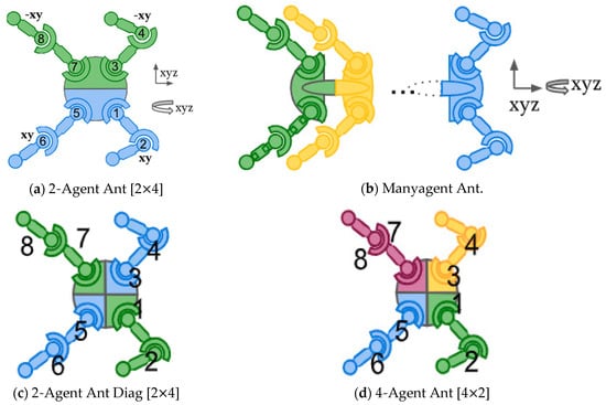 Simulation experiments were carried out in a single multi-legged ant robot in MAMuJoCo environment, a locally observable continuous cooperative multi-agent robot control benchmark. Each agent could only observe its own joint and body shape, and a joint reward value could only be obtained after multiple agents completed cooperation. The simulation environment is shown in the Figure 3, where square brackets indicate [(number of agents) (joints per agent)]. Colors indicate agent partitionings. For details, see https://github.com/schroederdewitt/multiagent_mujoco (accessed on 14 October 2024).