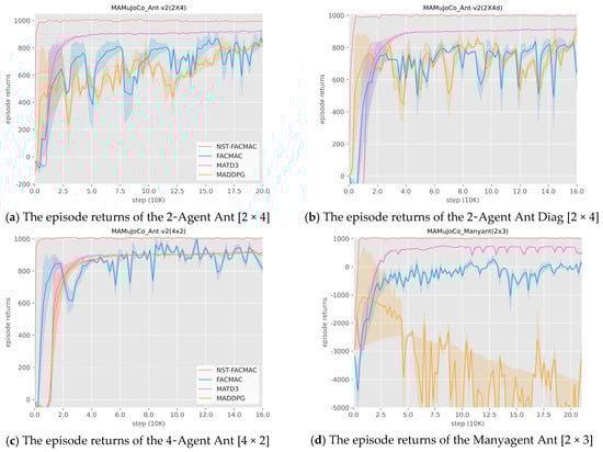 In order to verify the effectiveness of NST-FACMAC, it is compared with MADDPG, FACMAC, and MATD3 multi-agent deterministic strategy algorithms, and the experimental results are in Figure 4: