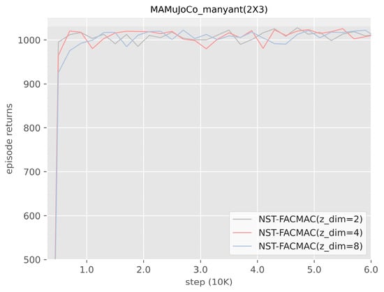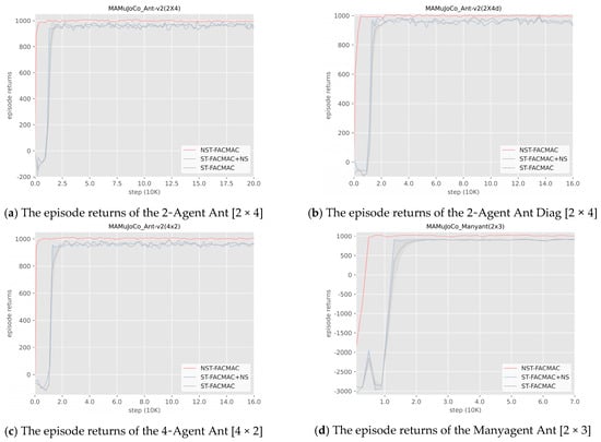 In this experiment, NST-FACMAC, ST-FACMAC+NS, and ST-FACMAC algorithms implement three different exploration strategies based on the integration of local state transition mechanism components. NST-FACMAC adopts the centralized novelty exploration strategy proposed in this paper (Formula (10)), and ST-FACMAC only adopts the Gaussian strategy, which is the most commonly used in the multi-agent strategy gradient algorithm, for exploration. ST-FACMAC+NS adopts both the centralized novelty strategy and the Gauss strategy to observe whether further enhancing the agent’s exploration capability on top of the exploration strategy proposed in this paper is conducive to the cooperation of agents to accomplish this task. The experimental results show that NST-FACMAC and ST-FACMAC+NS converge faster than ST-FACMAC; that is, the algorithm with a centralized novelty strategy converges faster than the algorithm without a centralized novelty strategy. Therefore, it can be seen that using a centralized novelty strategy can improve the learning speed of agents. NST-FACMAC ultimately receives a higher return value than ST-FACMAC+NS, which further indicates that the agent can fully explore by adopting the centralized novelty exploration strategy and does not need to explore using Gaussian noise.