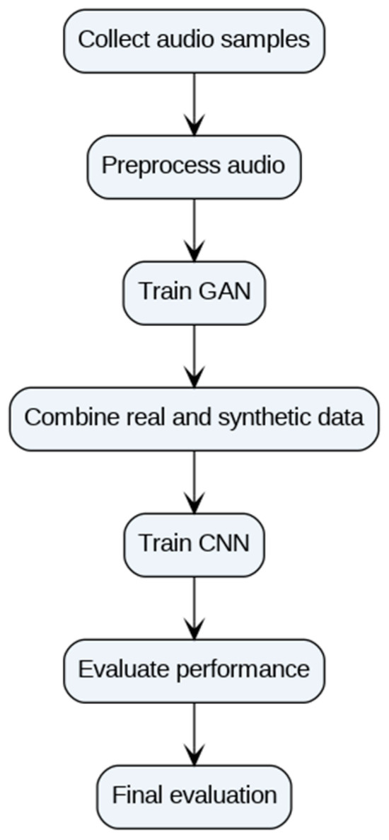 The methodology described here proposes an algorithm combining both CNN and GAN in an innovative way to address the challenge of limited data in voiceprint recognition, named GAN-enhanced CNN for voiceprint recognition (GEC-VR). The CNN is used for classification, while the GAN model augments the dataset by generating new audio samples, thus enhancing the training process, as Figure 1 shows. The detailed description is as follows: