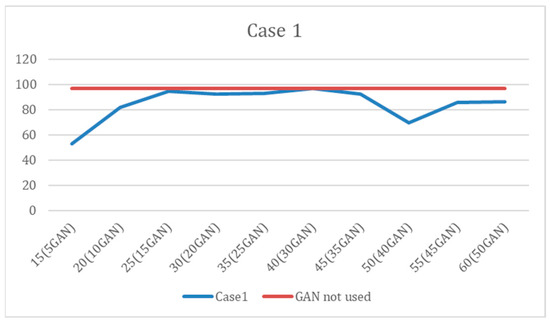 To more clearly observe the effects of different GAN sample sizes on accuracy, the number of GAN-generated samples was progressively reduced from 60 to 5, with each reduction followed by 50 training sessions. The average accuracy was recorded after each reduction. Table 5 illustrates how the accuracy varied depending on the number of GAN samples generated for Case 1. The results indicate that accuracy initially improved with more GAN samples but then declined, possibly due to the model overfitting to the generated data, as Figure 3 shows.