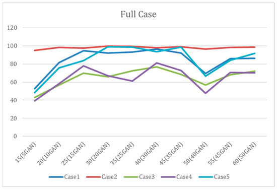 Accuracy of generated training for each case. In this table, ‘Cases’ refer to experimental configurations where the proportion of GAN-generated samples to real samples is systematically varied.