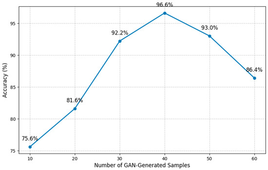 The experiments verified that the use of GAN-generated samples significantly improves the performance of the CNN-MFCC voiceprint recognition model in cases with limited data, where the original accuracy is low. The number of GAN samples generated is also critical: blindly increasing the number of generated samples does not always lead to higher accuracy. Instead, selecting the right number of GAN-generated samples for each case can yield better results. Figure 5 illustrates the trend of accuracy (%) as the number of GAN-generated samples increases. Accuracy improves significantly up to 40 samples but declines beyond this point, indicating a potential overfitting effect with excessive synthetic data. This visualization complements the experimental results by showing how accuracy initially improves but later declines due to potential overfitting when the number of GAN-generated samples becomes excessive. The study evaluated various GAN-to-real sample mixing ratios to identify optimal configurations for practical applications. In resource-limited scenarios, a higher proportion of GAN-generated samples (e.g., 60–70%) is beneficial for enriching diversity, whereas a balanced ratio (30–50%) is preferable in data-rich environments to ensure robustness without overfitting.