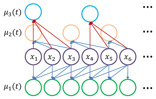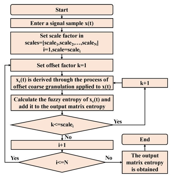 - The fuzzy entropy is calculated [28]. Given an N-dimensional signal (), the phase space dimension () and similarity tolerance (r) are defined. Then, the phase space is reconstructed aswhere . The fuzzy membership function is calculated bywhere and . The maximum absolute distance between window vectors and is obtained asTaking the average for each i yields , and is defined byThe fuzzy entropy of the original signal is denoted byIn the case of a finite dataset, the fuzzy entropy can be estimated as . The combination of all fuzzy entropy is the improved multiscale fuzzy entropy, and the output entropy matrix is .